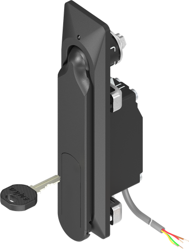 Cam lock with status feedback and automatic unlock in case of power failure; Open collector output A1 indicates if cam is engaged in the catch